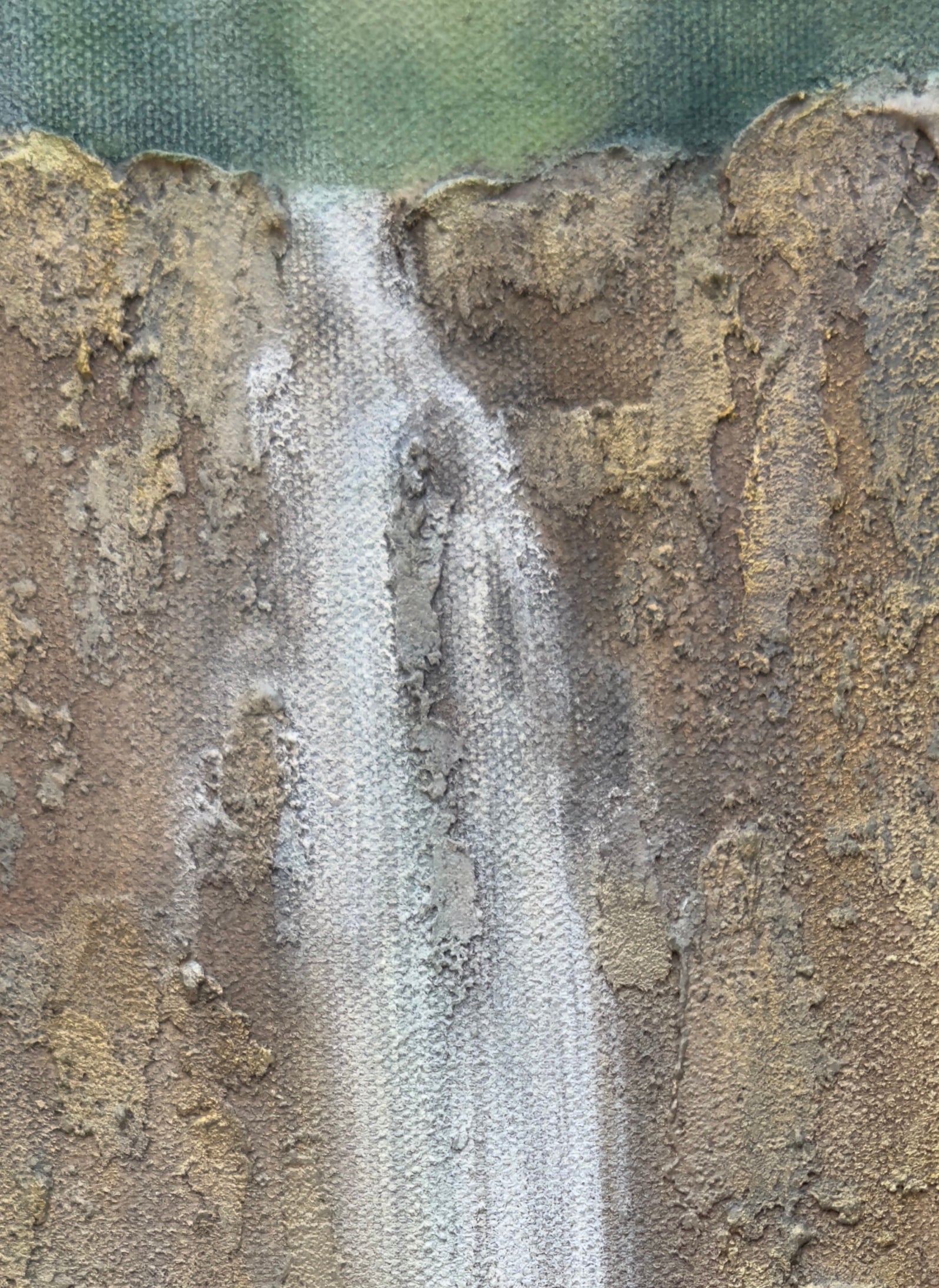 This original waterfall painting of Paihi Falls seen from the Hana Hwy in Kipahulu, Maui captures the quiet power and grace of water in motion. The falls are brought to life using natural marble and limestone which creates rich textures that echo the rugged surface of stone. The soft greenery above hints at the lush life sustained by the flowing waters, while the vertical sweep of the cascade draws the eye downward in a calming rhythm.