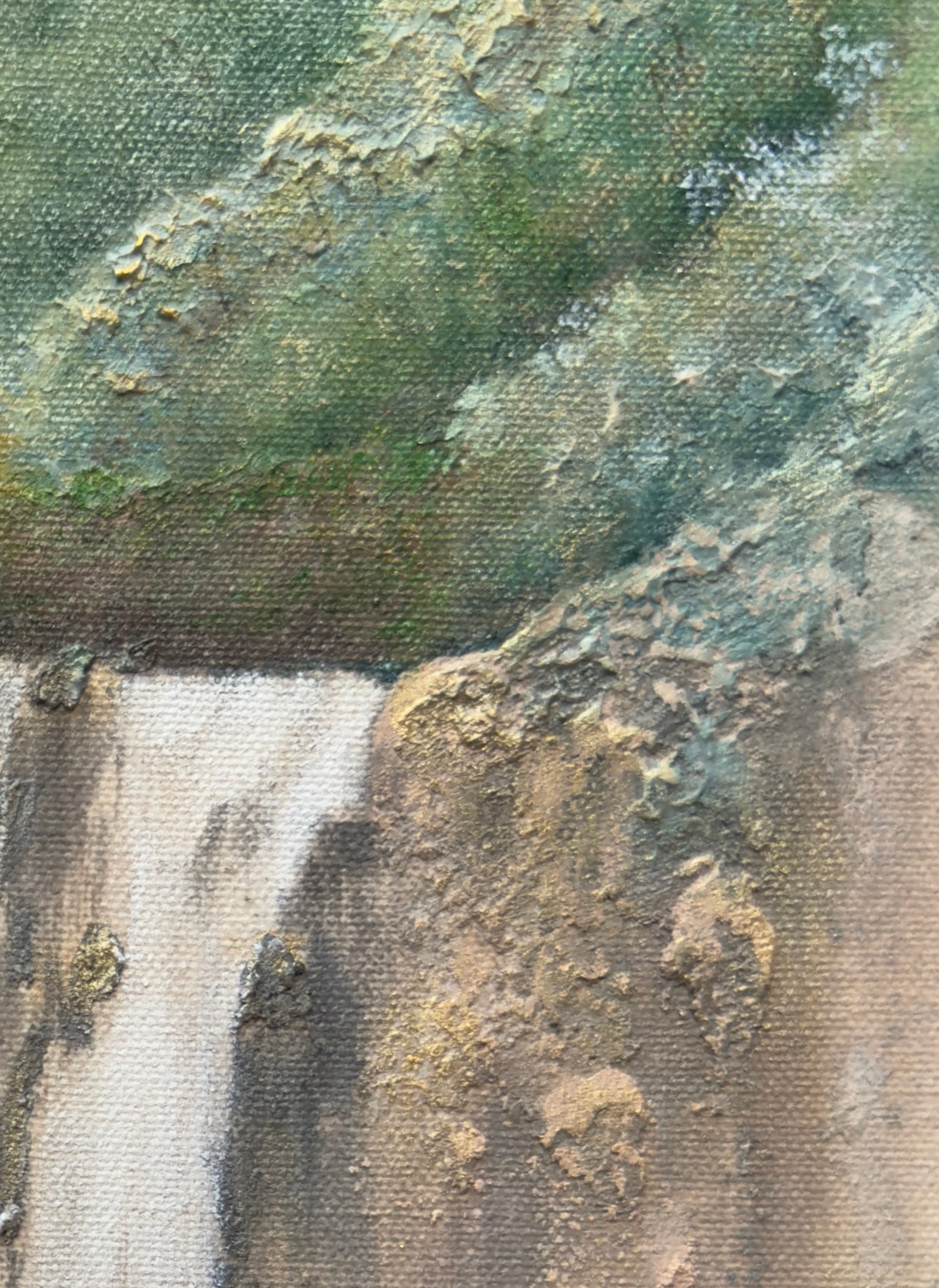 This original waterfall painting of Seven Sacred Pools in Kipaluhu, Maui captures both strength and serenity. Cascading water tumbles gracefully over textured stone created with natural marble and limestone giving the piece a tactile quality that makes the rushing water and rocky cliffs feel alive. The arched bridge above, softened by mist and lush greenery, adds a timeless human touch to the grandeur of nature.