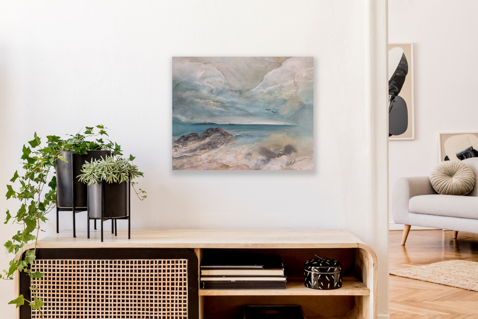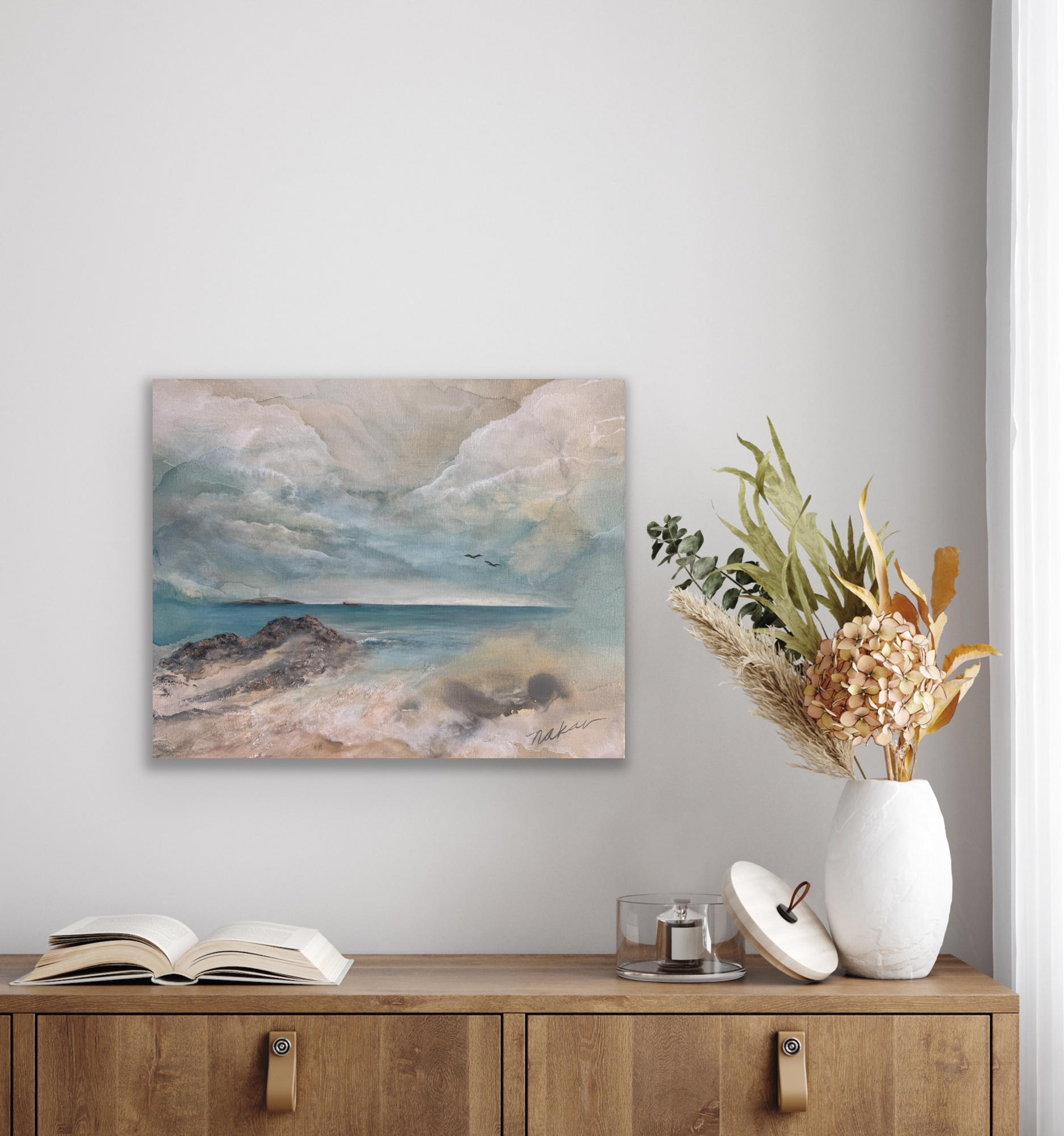 “Sanctuary” transforms the serene shores of Makena Cove into a calming visual retreat. Gentle ocean hues layered with limestone and marble textures create a peaceful presence. This work of art is designed to lift your mood and bring a sense of restoration and ease into your everyday moments.